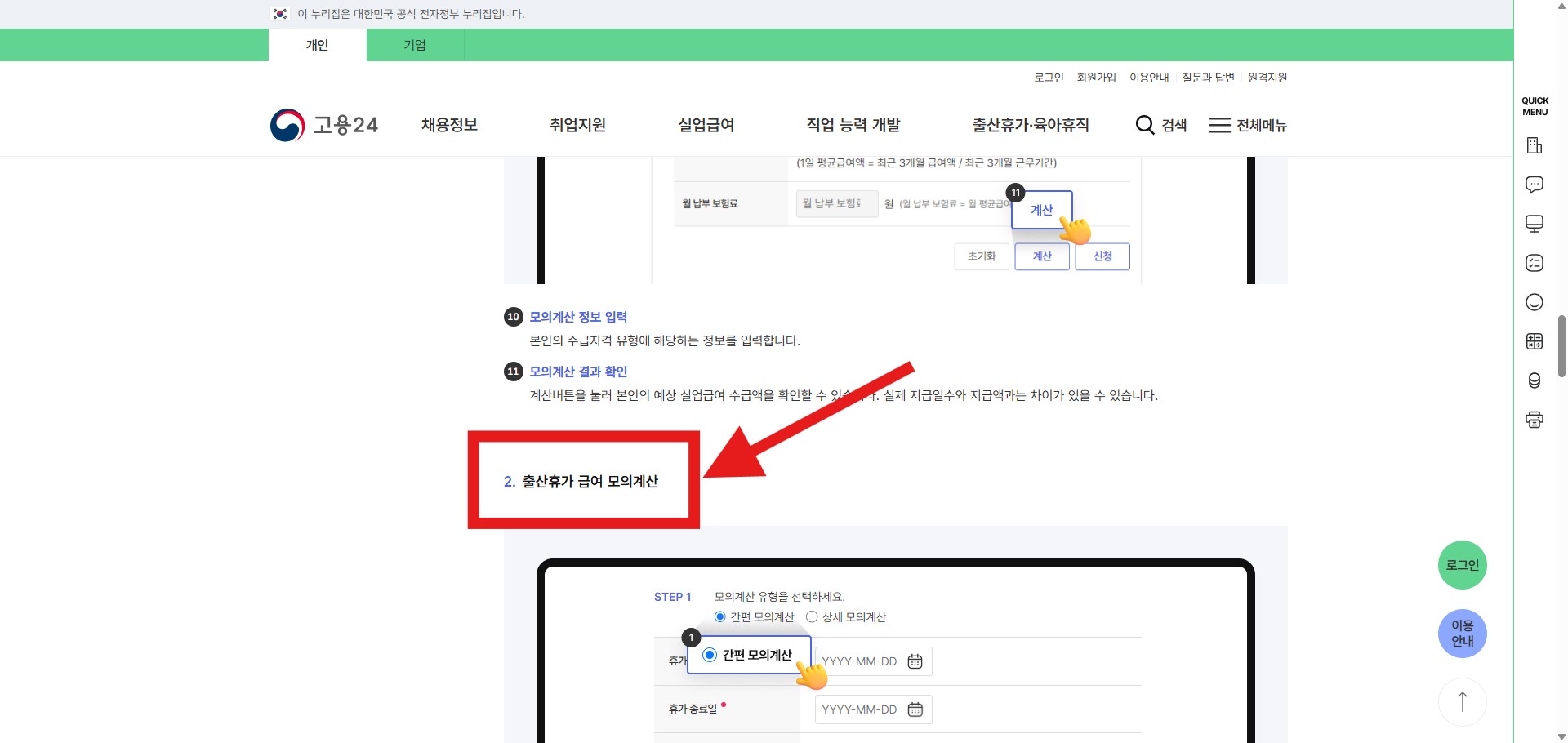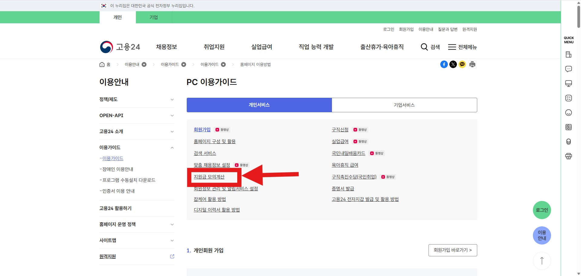 3. 고용24 지원금 모의계산 접근 방법